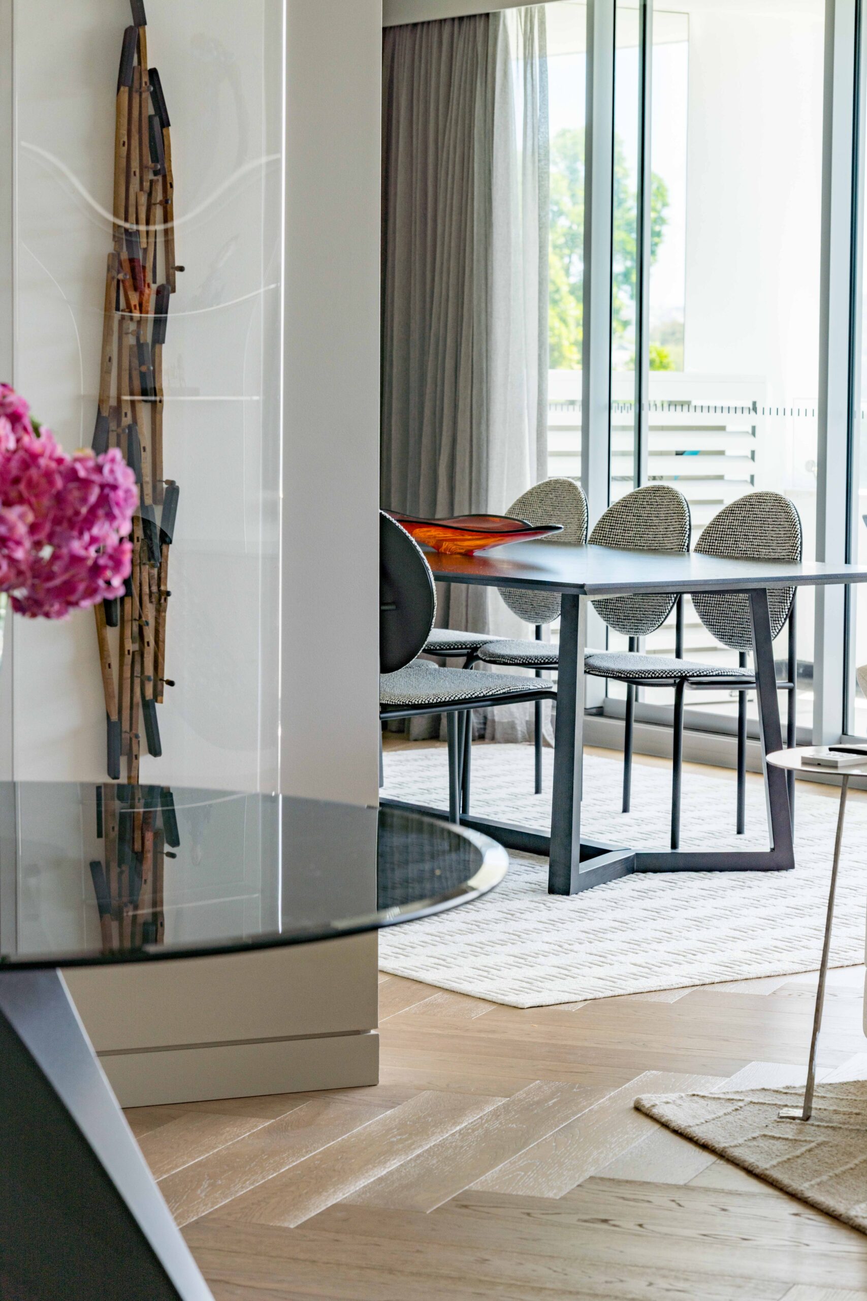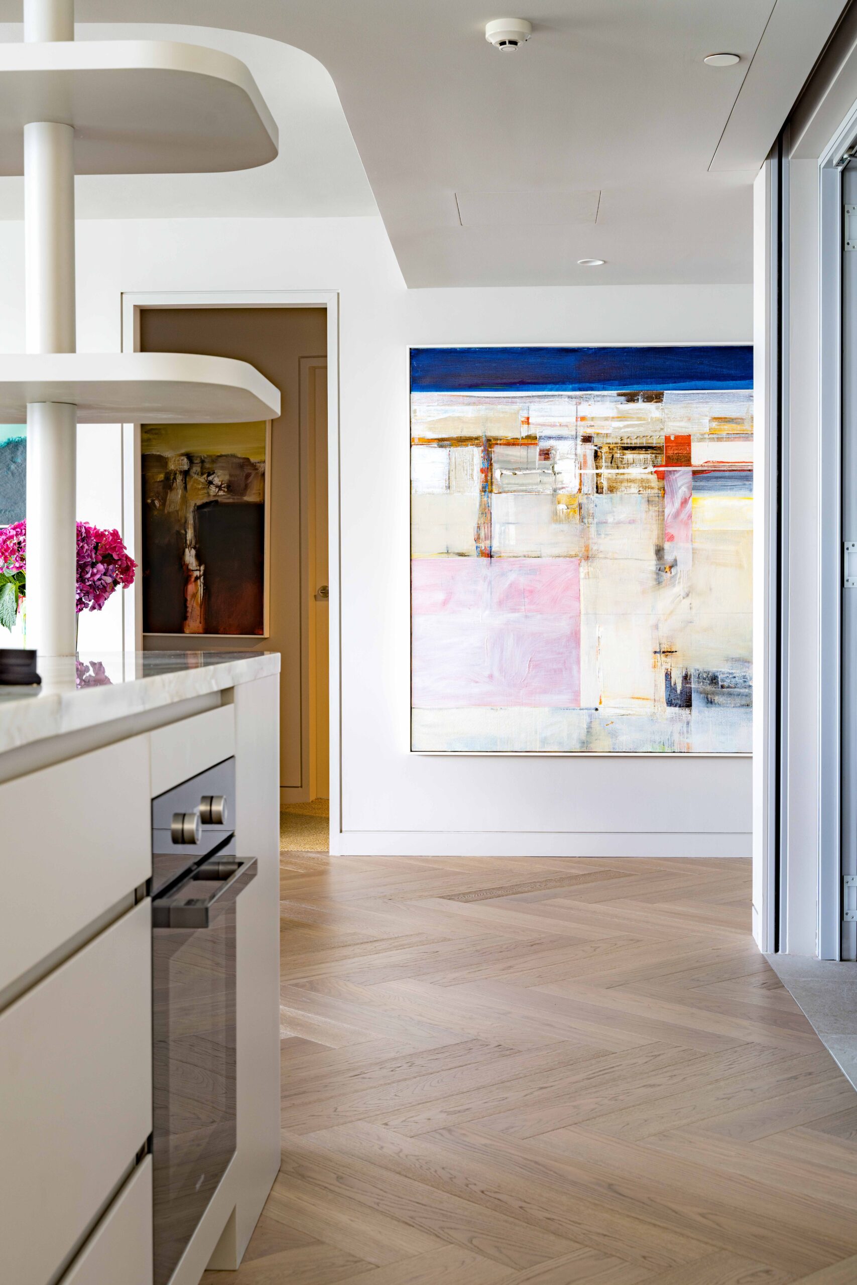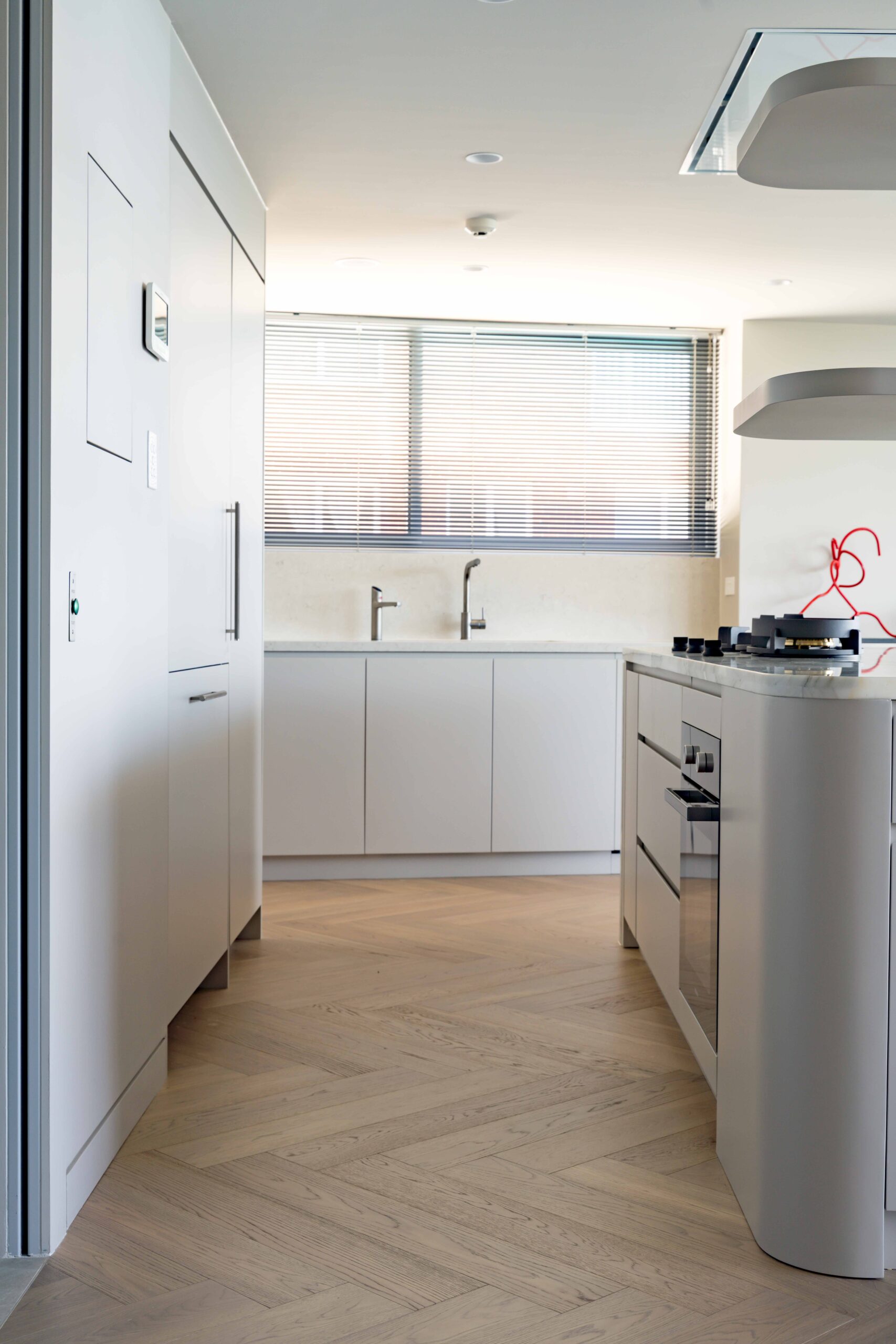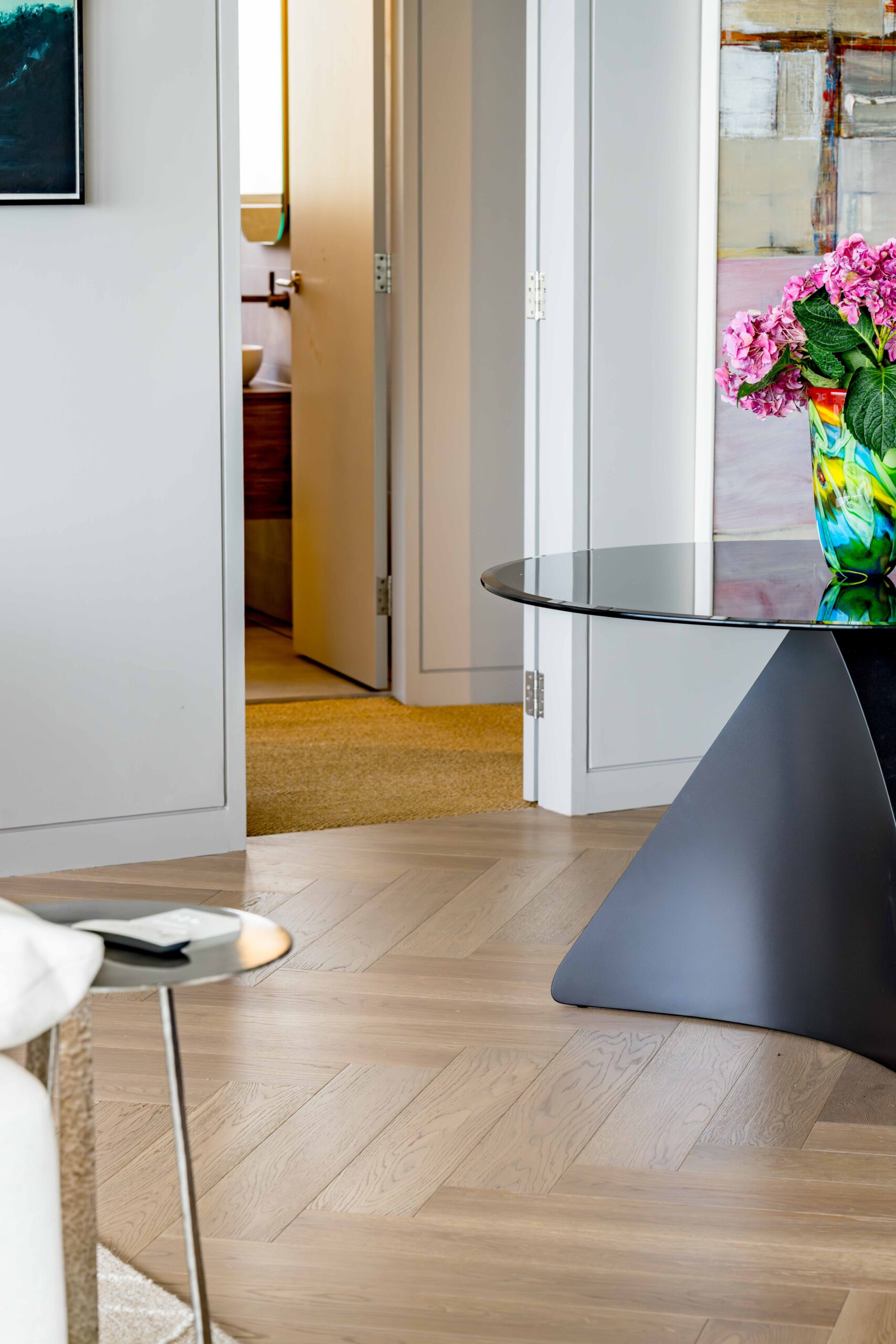 The herringbone European Oak parquetry adds architectural rhythm and sophistication, elevating the penthouse while remaining understated and timeless. Its natural tone enhances the flow of light and complements the waterviews without competing with them. In the bedrooms, sisal carpet introduces texture and warmth, creating a calm, retreat-like atmosphere that contrasts beautifully with the structured parquetry, while maintaining a cohesive, high-end finish throughout the home.