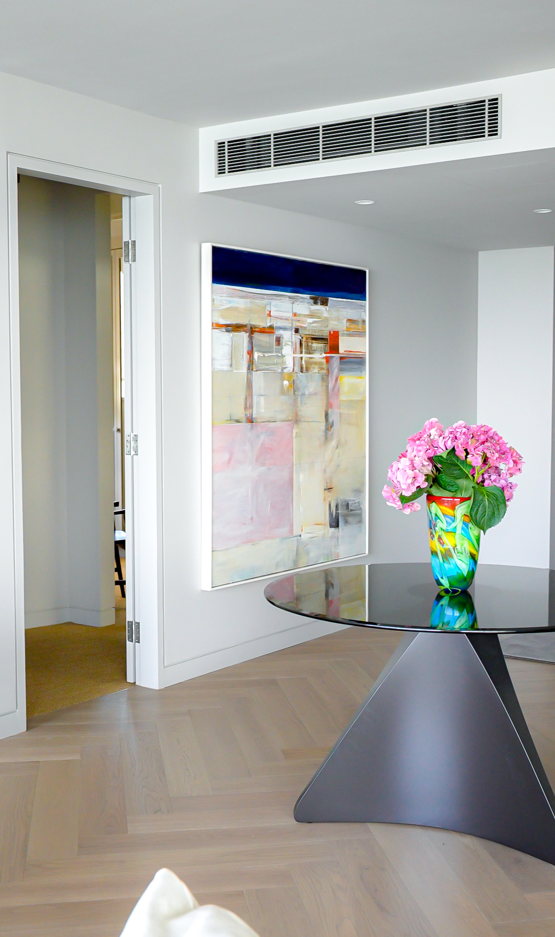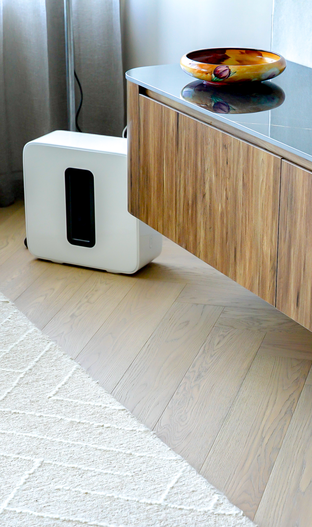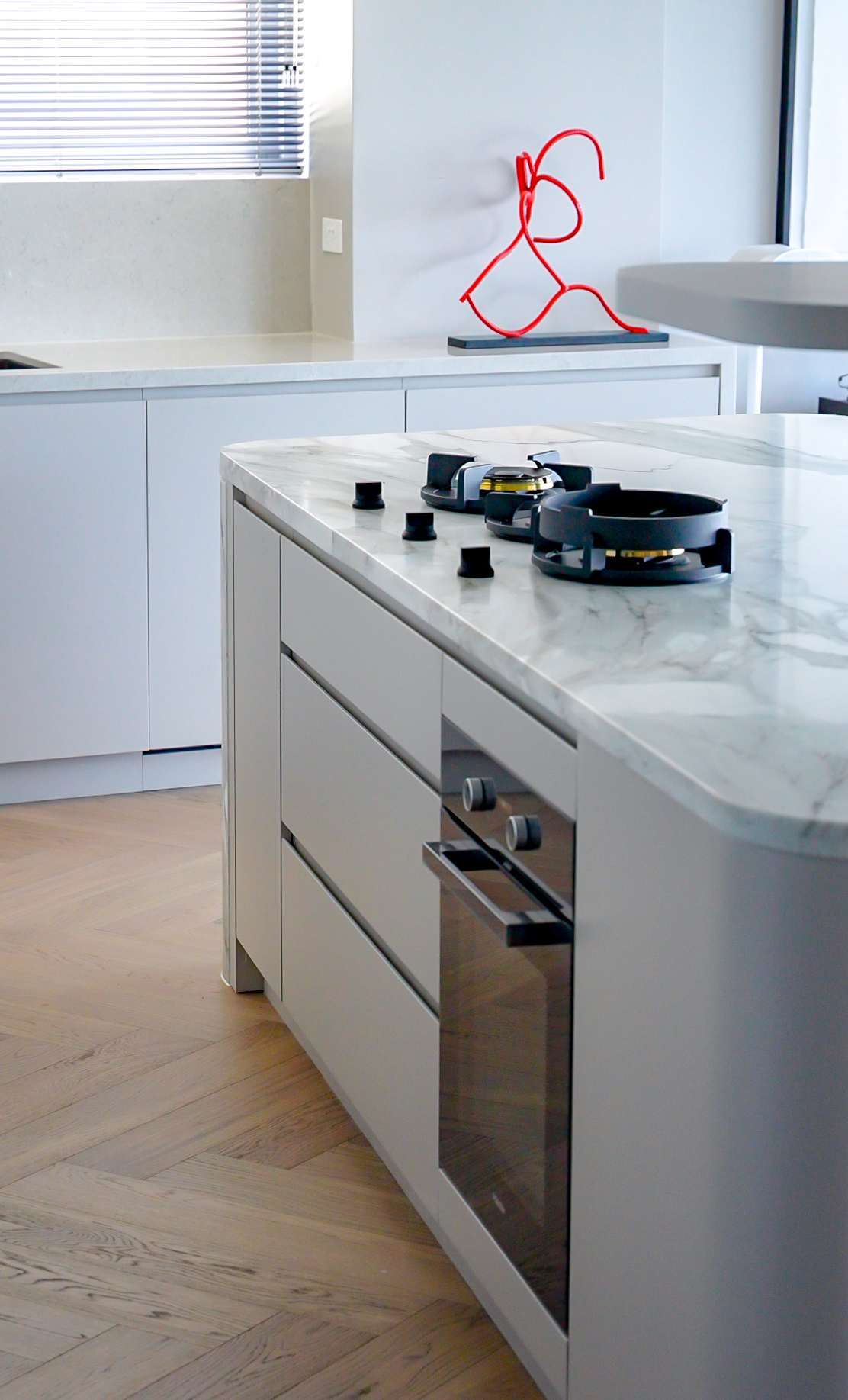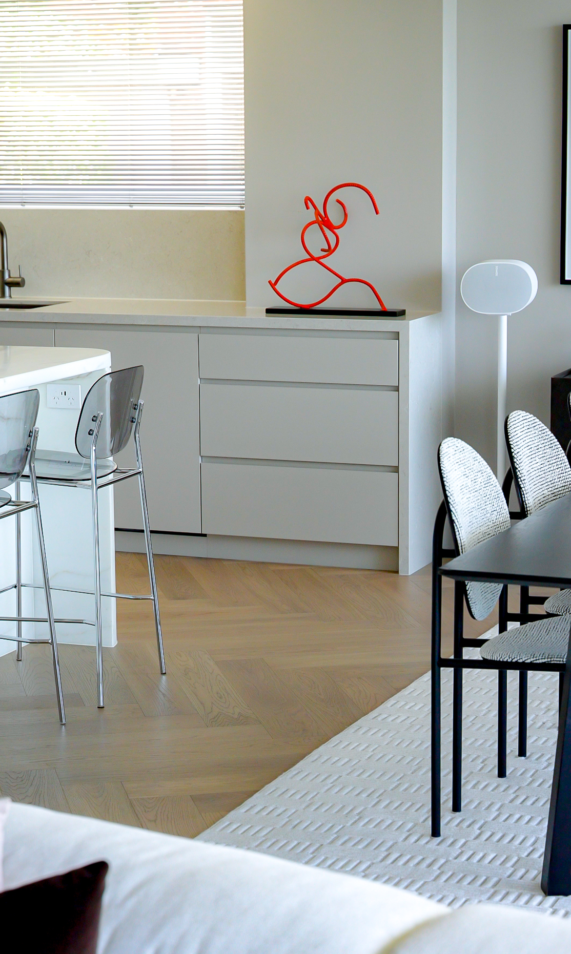 The herringbone European Oak parquetry adds architectural rhythm and sophistication, elevating the penthouse while remaining understated and timeless. Its natural tone enhances the flow of light and complements the waterviews without competing with them. In the bedrooms, sisal carpet introduces texture and warmth, creating a calm, retreat-like atmosphere that contrasts beautifully with the structured parquetry, while maintaining a cohesive, high-end finish throughout the home.