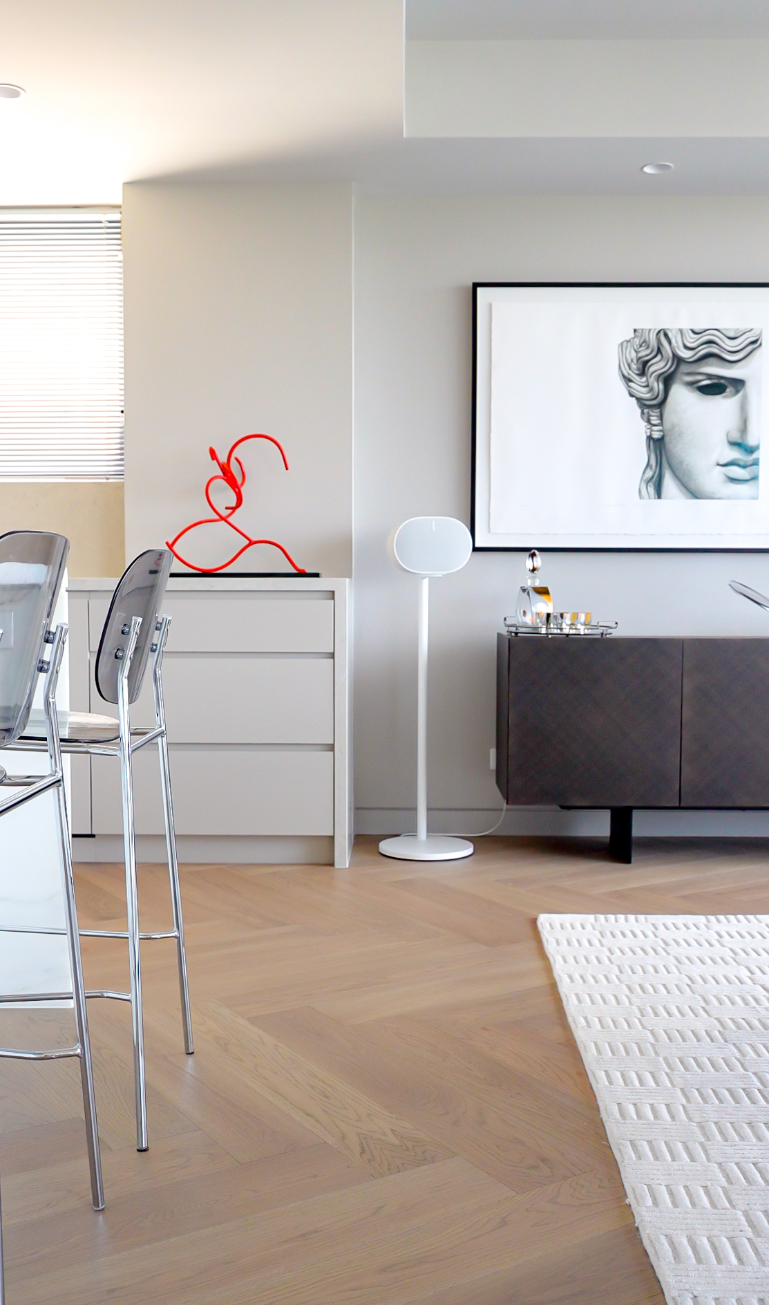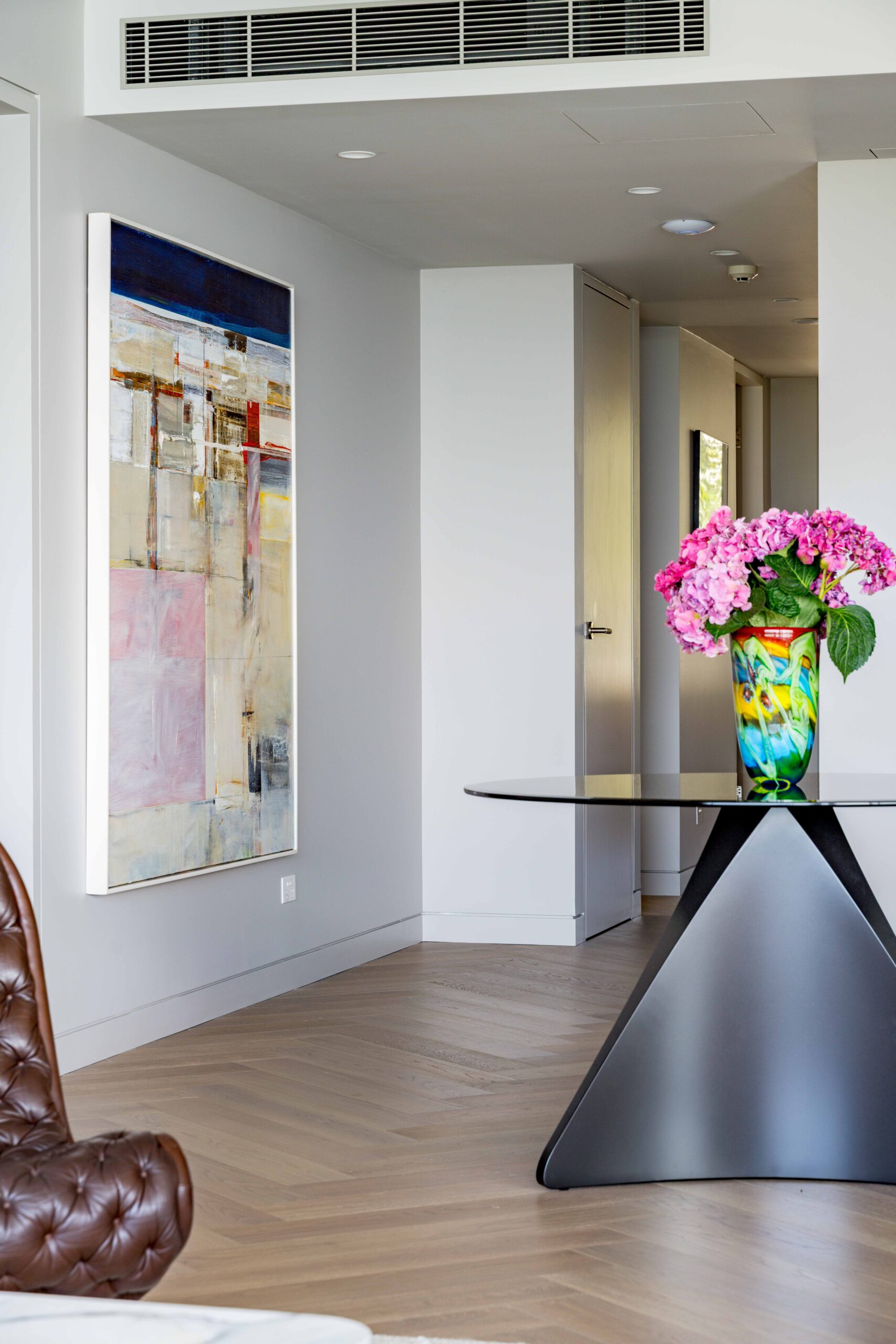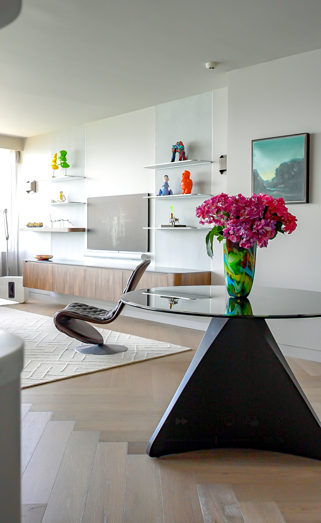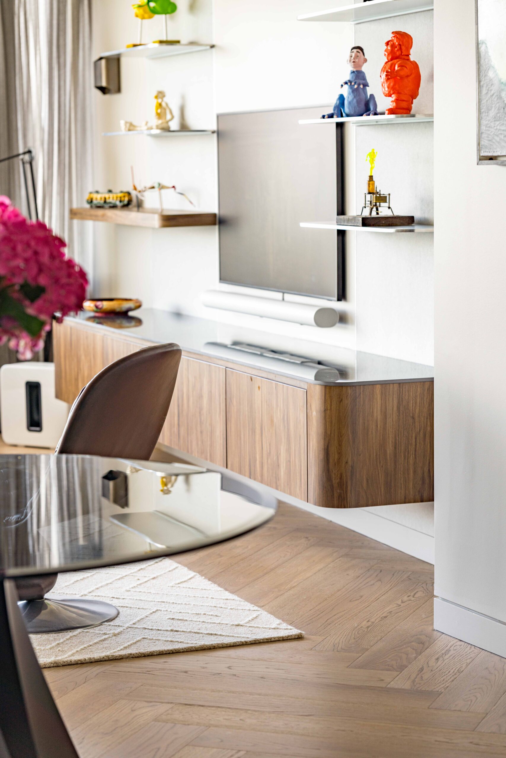 The herringbone European Oak parquetry adds architectural rhythm and sophistication, elevating the penthouse while remaining understated and timeless. Its natural tone enhances the flow of light and complements the waterviews without competing with them. In the bedrooms, sisal carpet introduces texture and warmth, creating a calm, retreat-like atmosphere that contrasts beautifully with the structured parquetry, while maintaining a cohesive, high-end finish throughout the home.