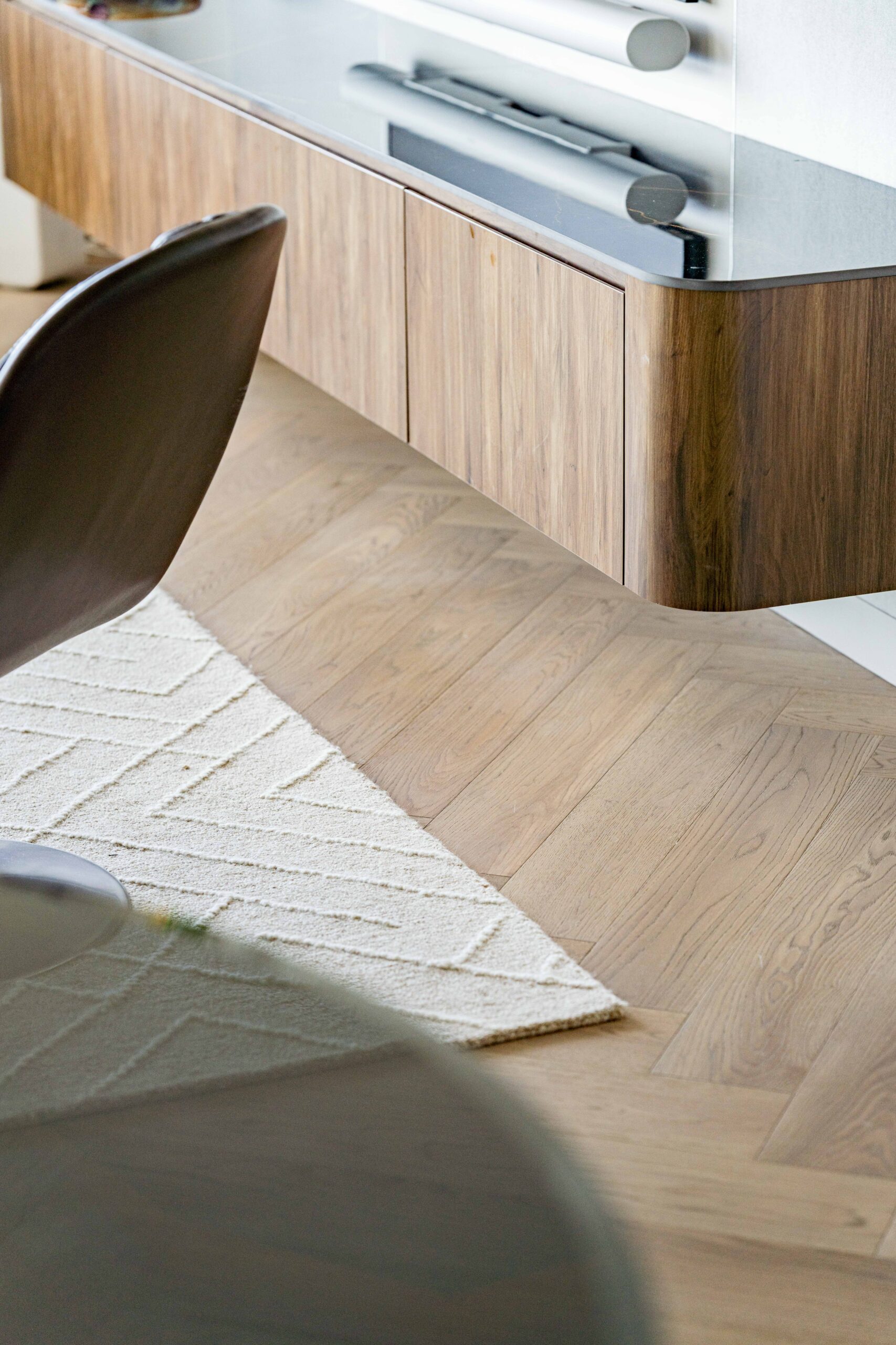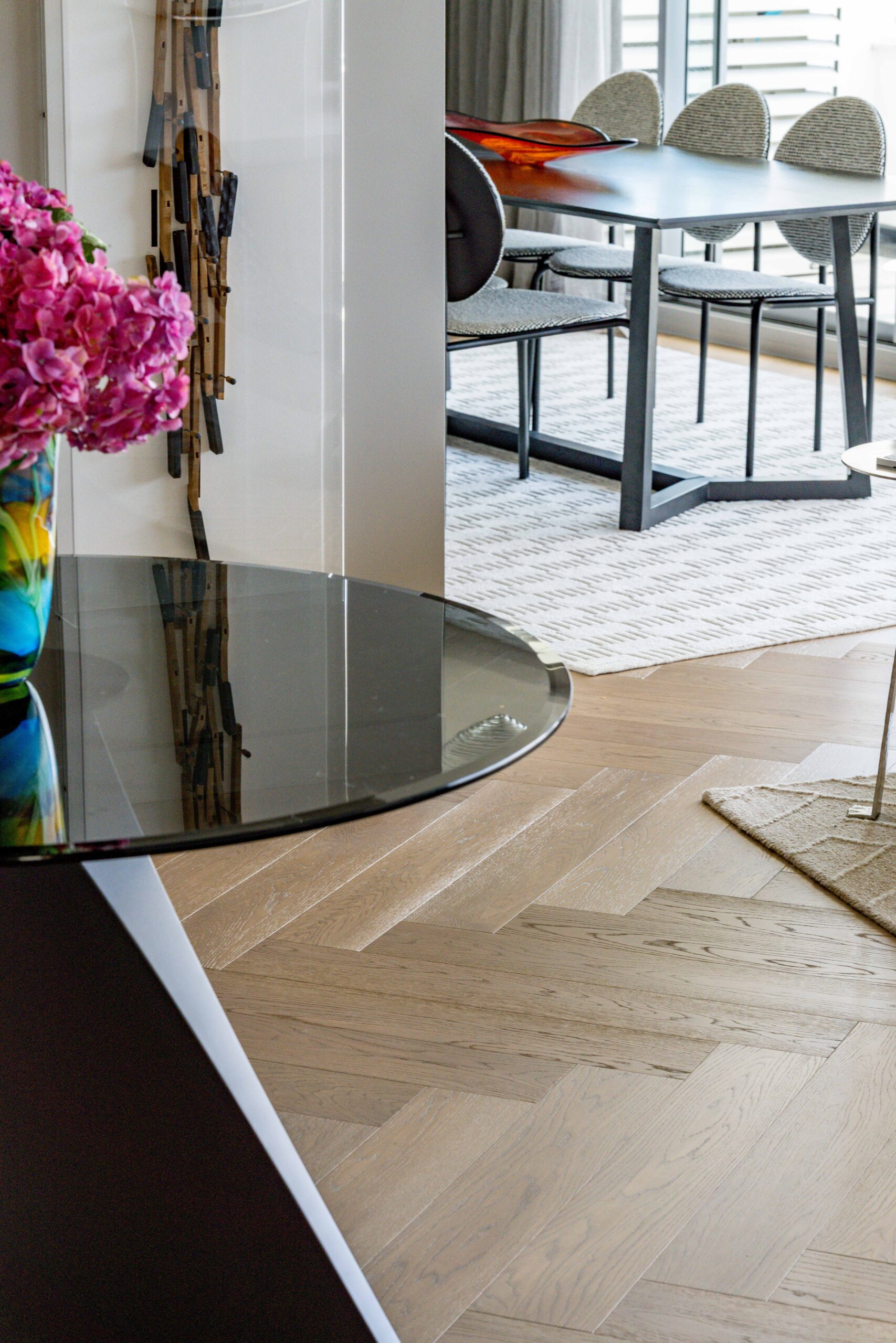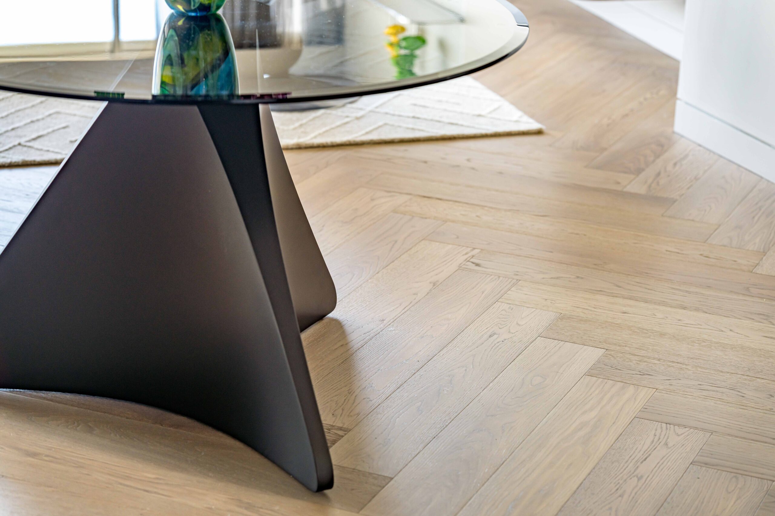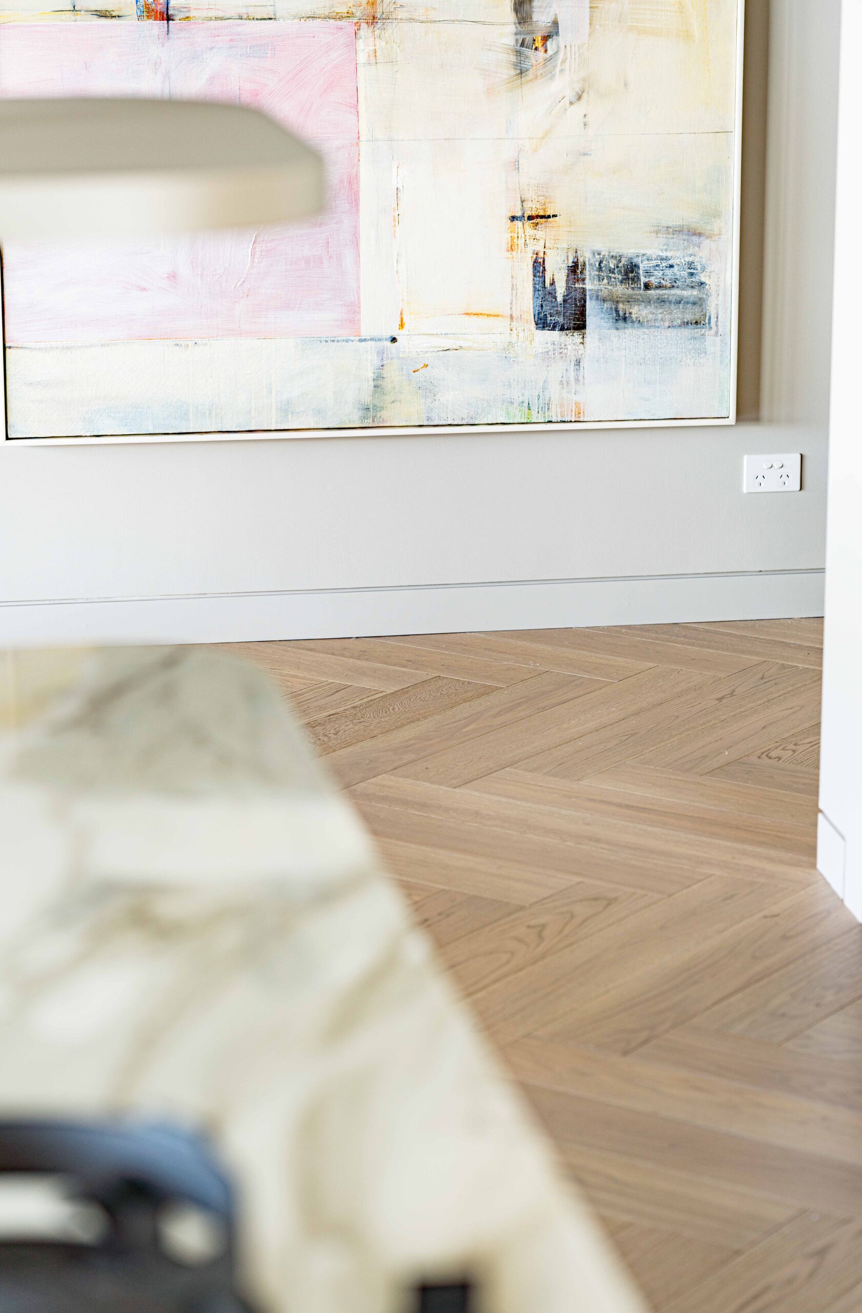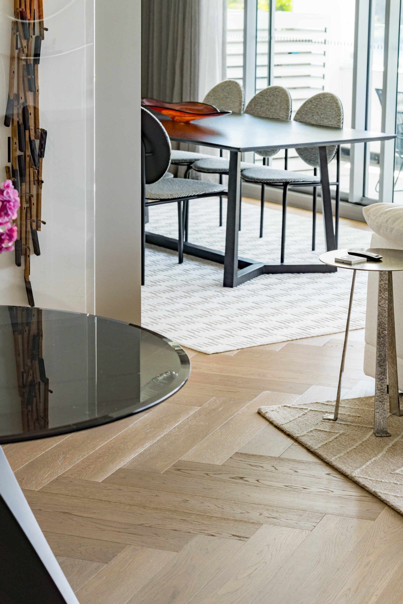 Supply and install European Oak parquetry in a herringbone pattern throughout the main living areas, including precise set-out, adhesive installation, perimeter detailing, and full delivery and carry-in of materials.