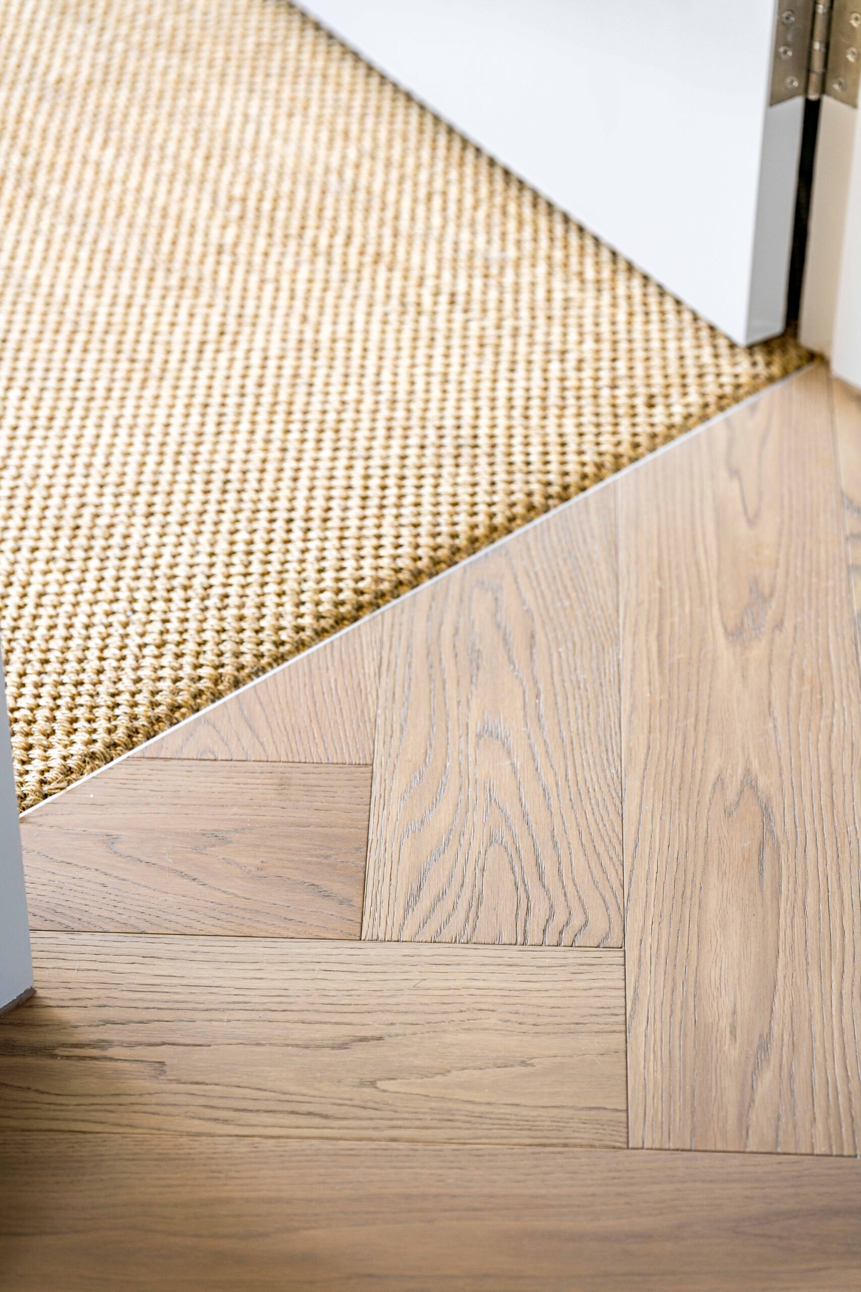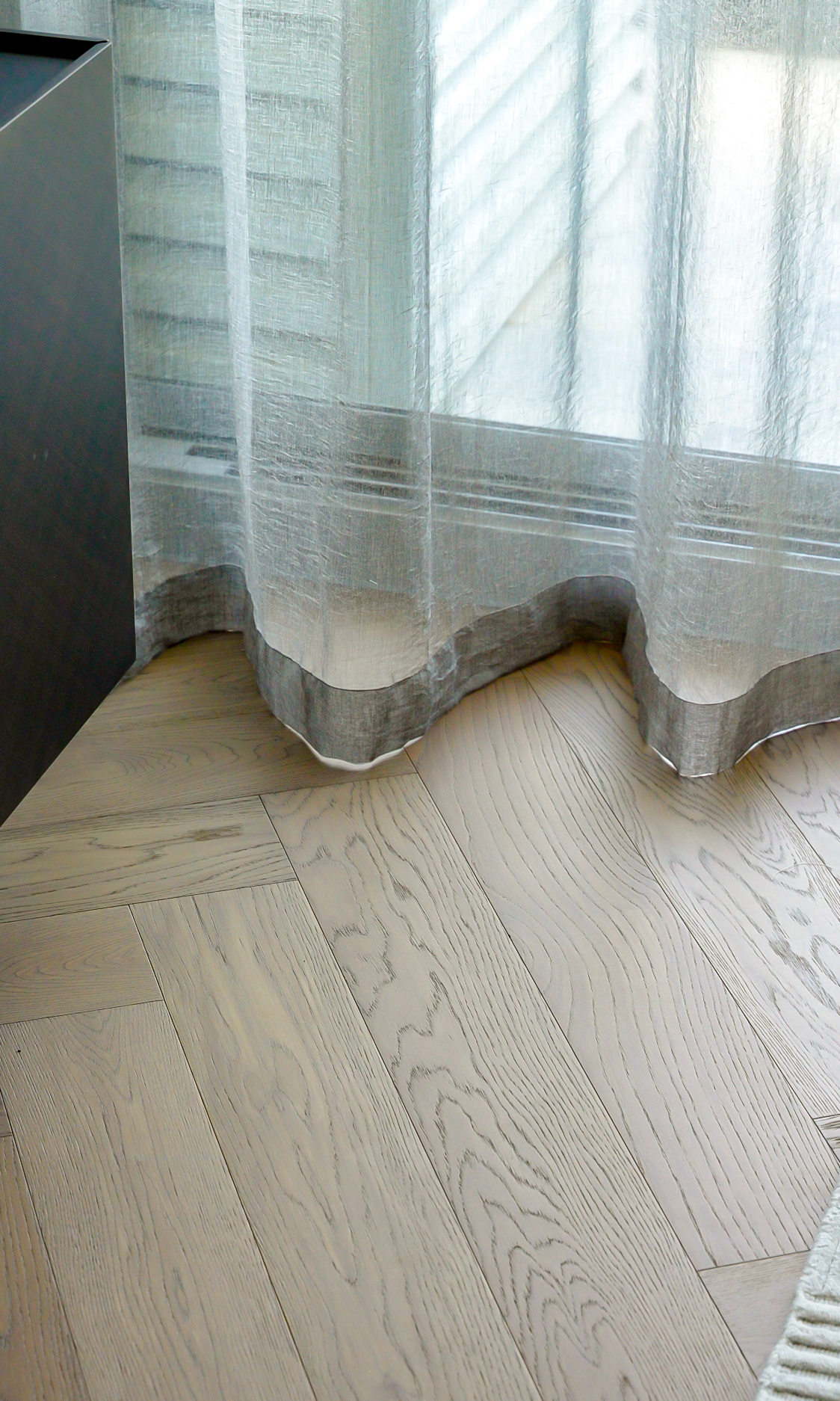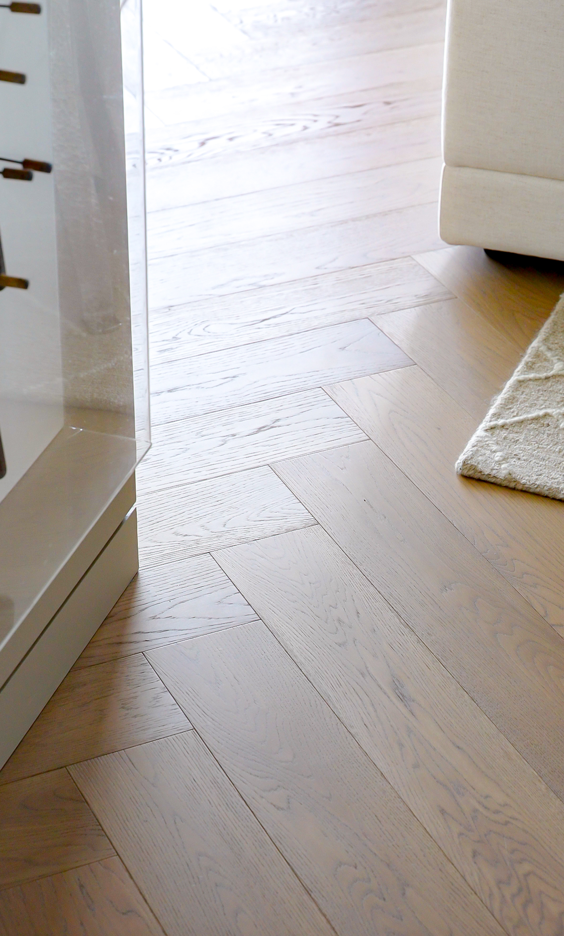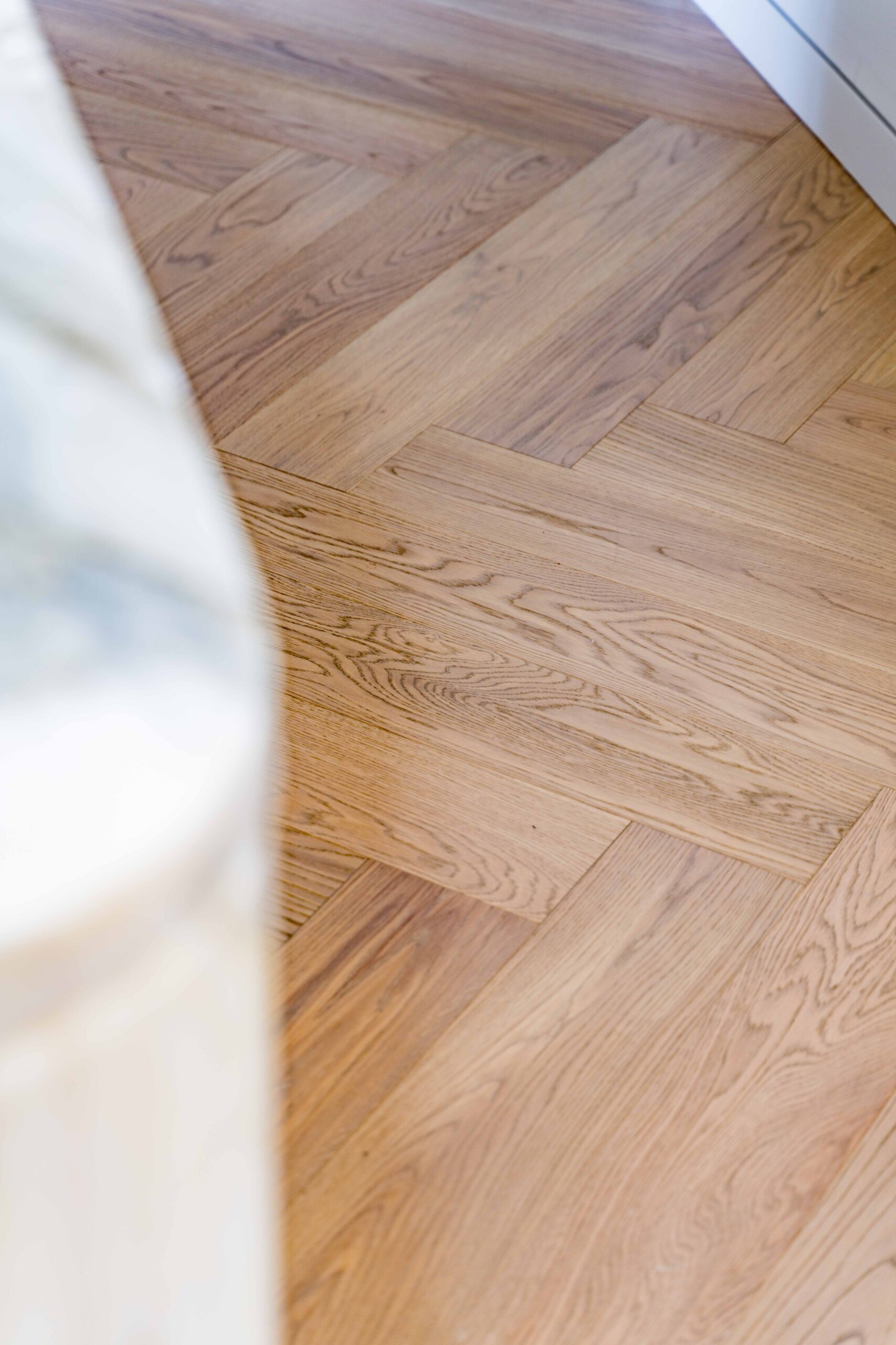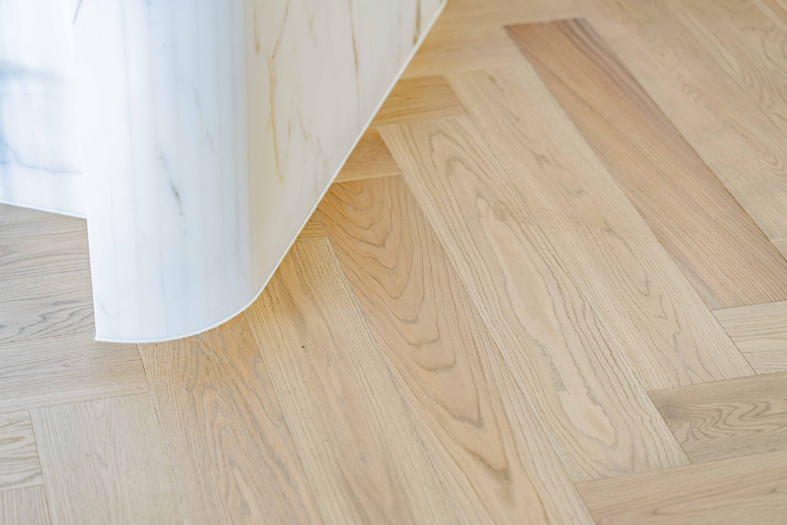 Supply and install European Oak parquetry in a herringbone pattern throughout the main living areas, including precise set-out, adhesive installation, perimeter detailing, and full delivery and carry-in of materials.